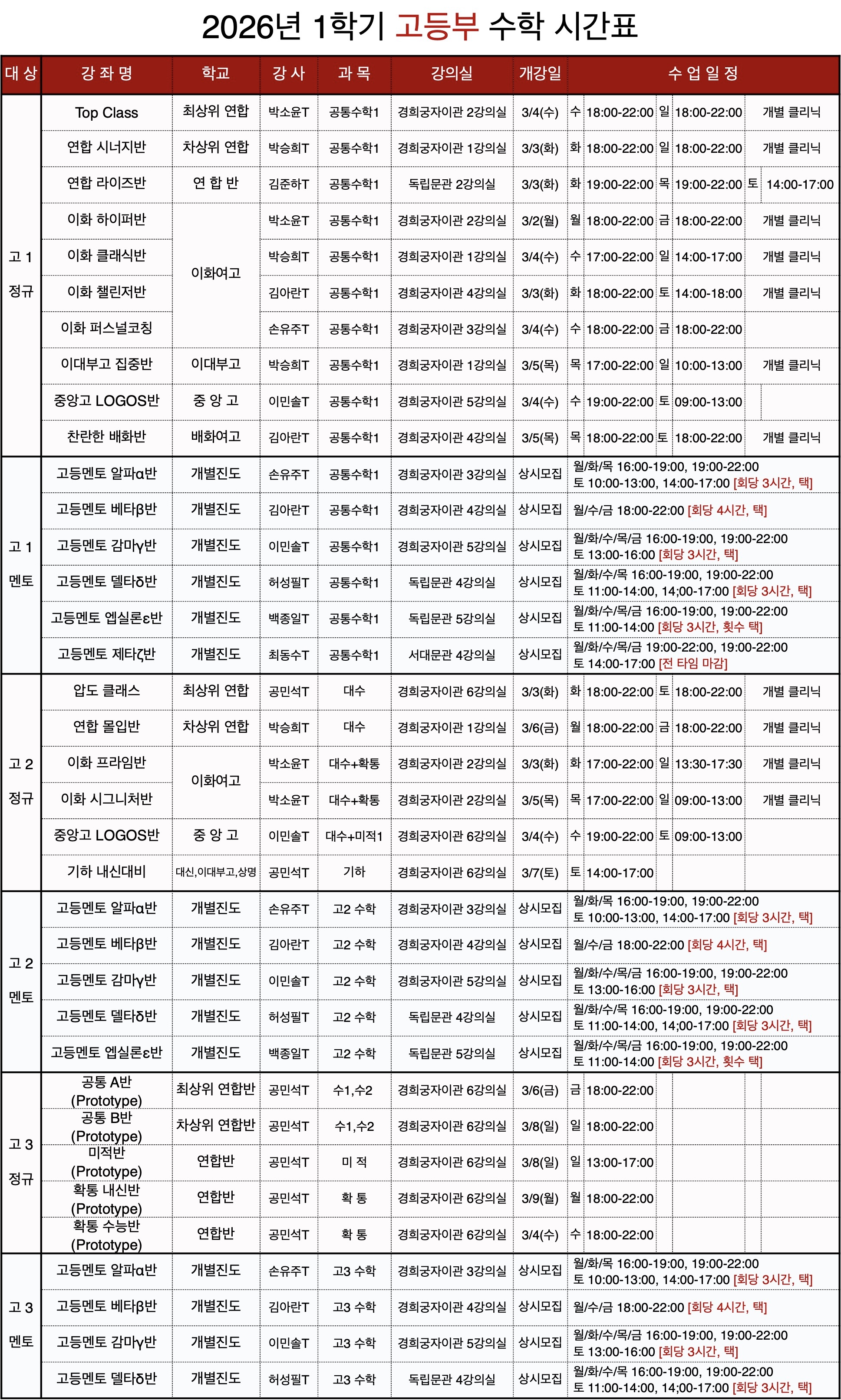 2026년 1학기 제이커브학원 고등부